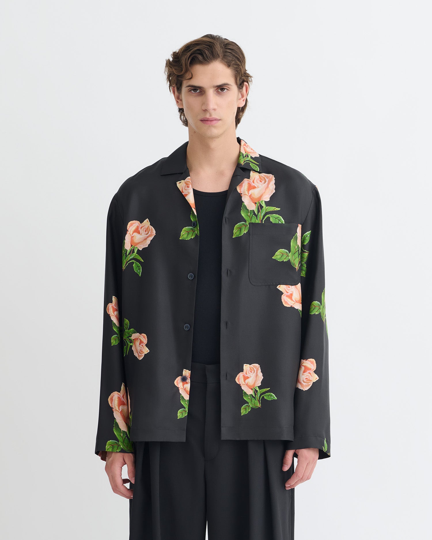 The Jamar shirt balances the worlds of ease and elegance. It’s made from lightweight silk twill embroidered with vibrant rose motifs and has a relaxed fit.