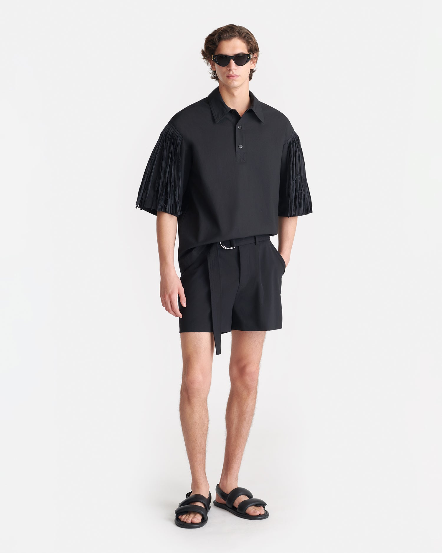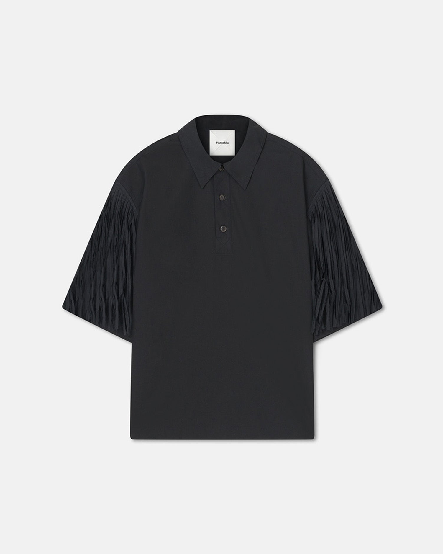 The Ilian shirt demonstrates our love of fabric manipulation. It is made from heavy poplin with fringed tech poplin sleeves for subtle texture difference.