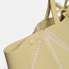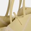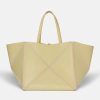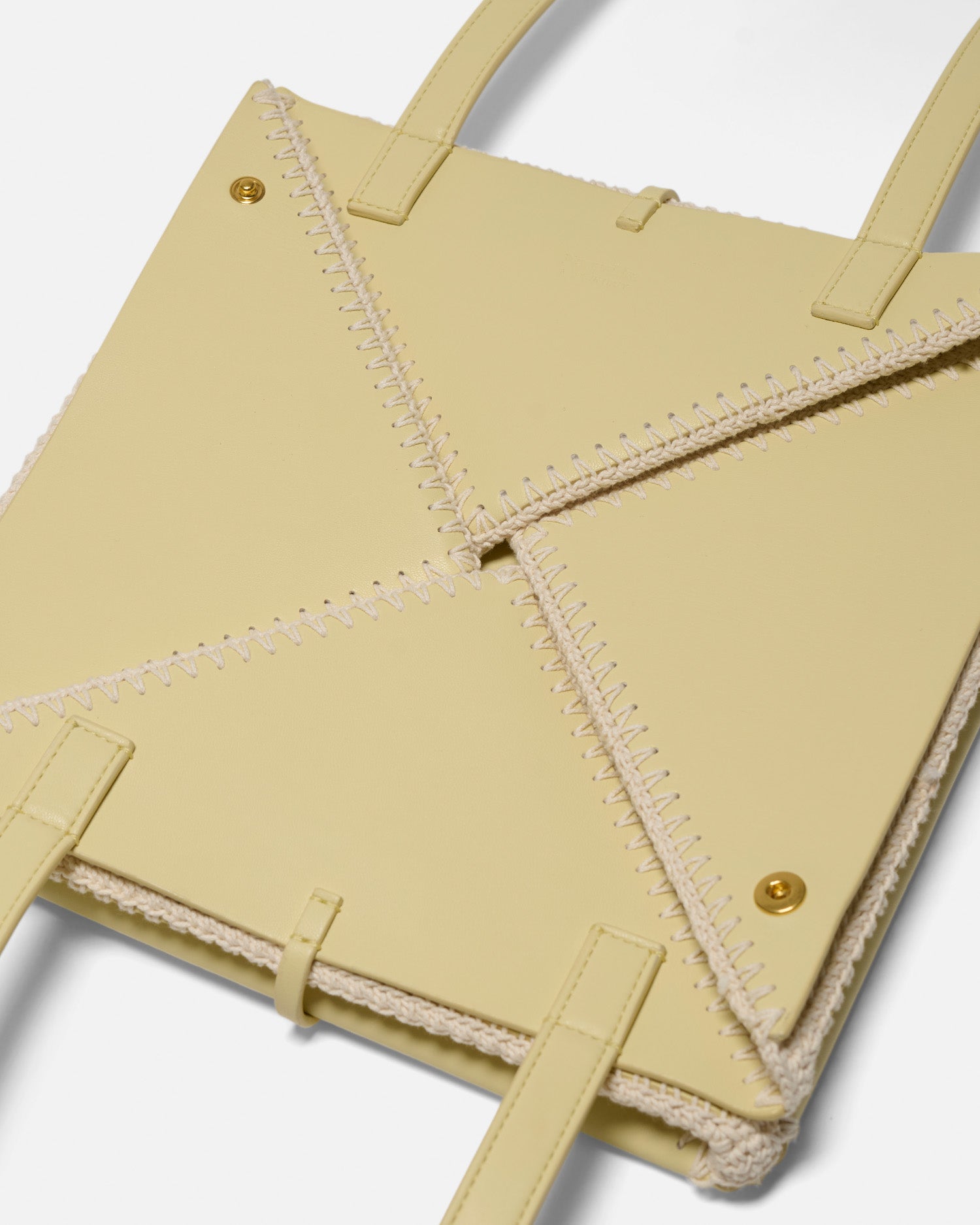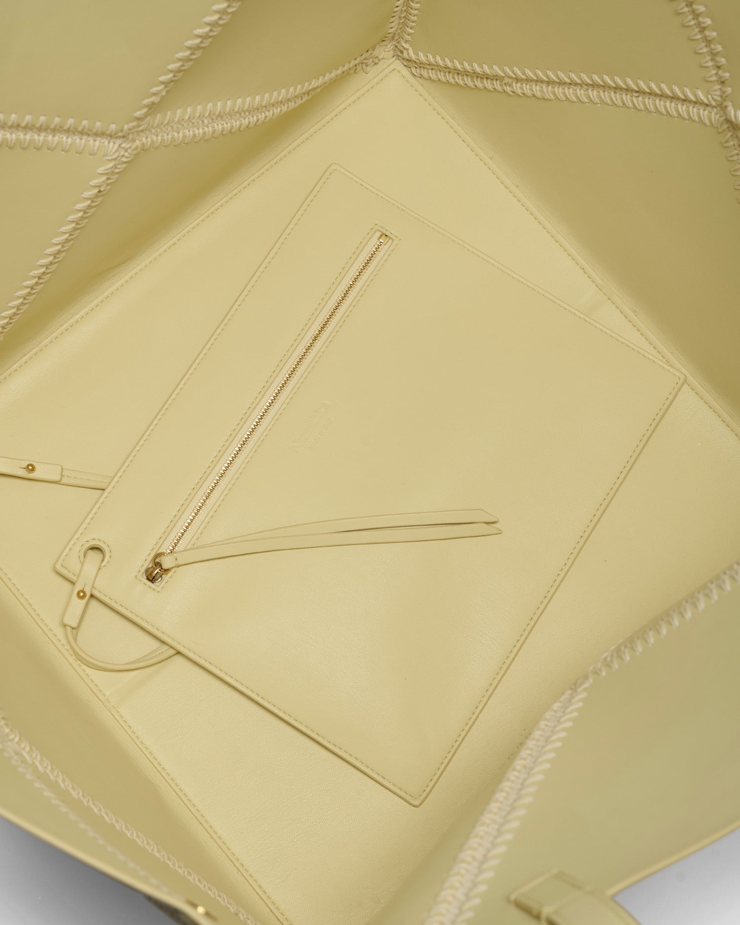 Origami tote folds completely flat to offer a functional solution for storing all your essentials, along with easy-to-carry shoulder straps. It is crafted from soft patent alt-nappa and detailed with contrast merrow stitching to create a patchwork effect.