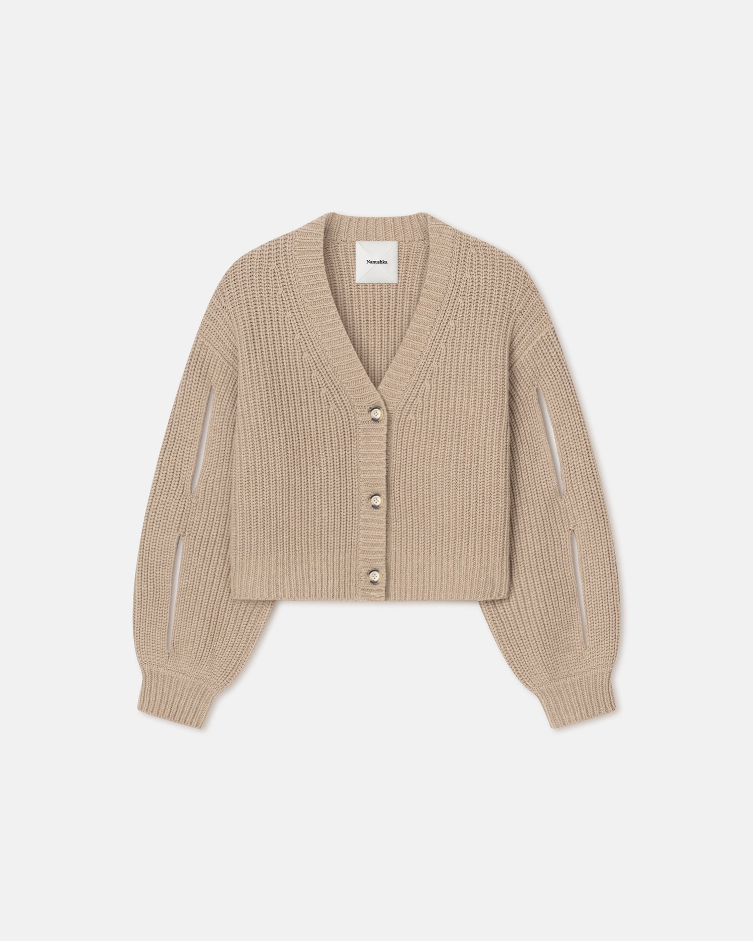 The Karolin cardigan is timeless with its soft cashmere-blend construction and oatmeal hue, but has a modern energy thanks to the cropped silhouette and cut-out sleeves. The ribbed finish accentuates the cosy feel.
