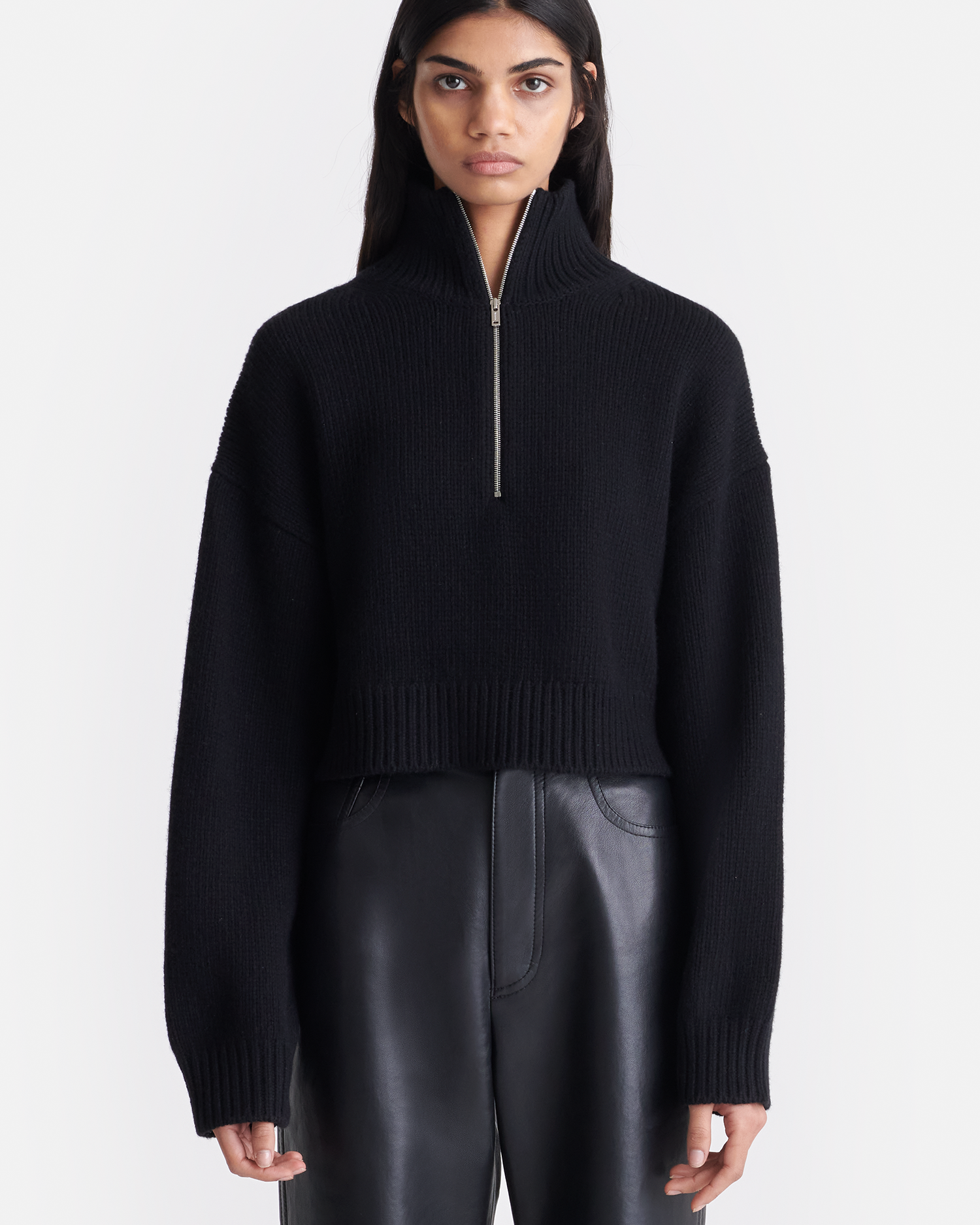 The Sonore sweater is made from plush cashmere blend and comes in black, making it both practice and versatile. It’s designed for an oversized, yet cropped fit and has a high quarter zip-up neck.