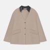 Our Jada Jacket juxtaposes sharp tailoring with an oversized fit. In stone double wool with a black regenerated leather collar.