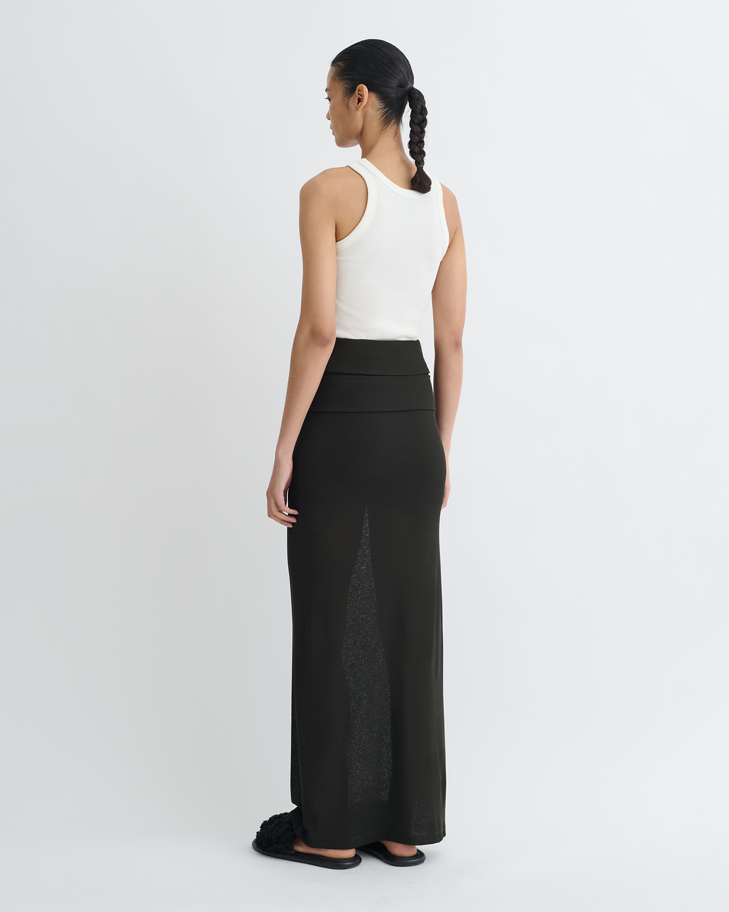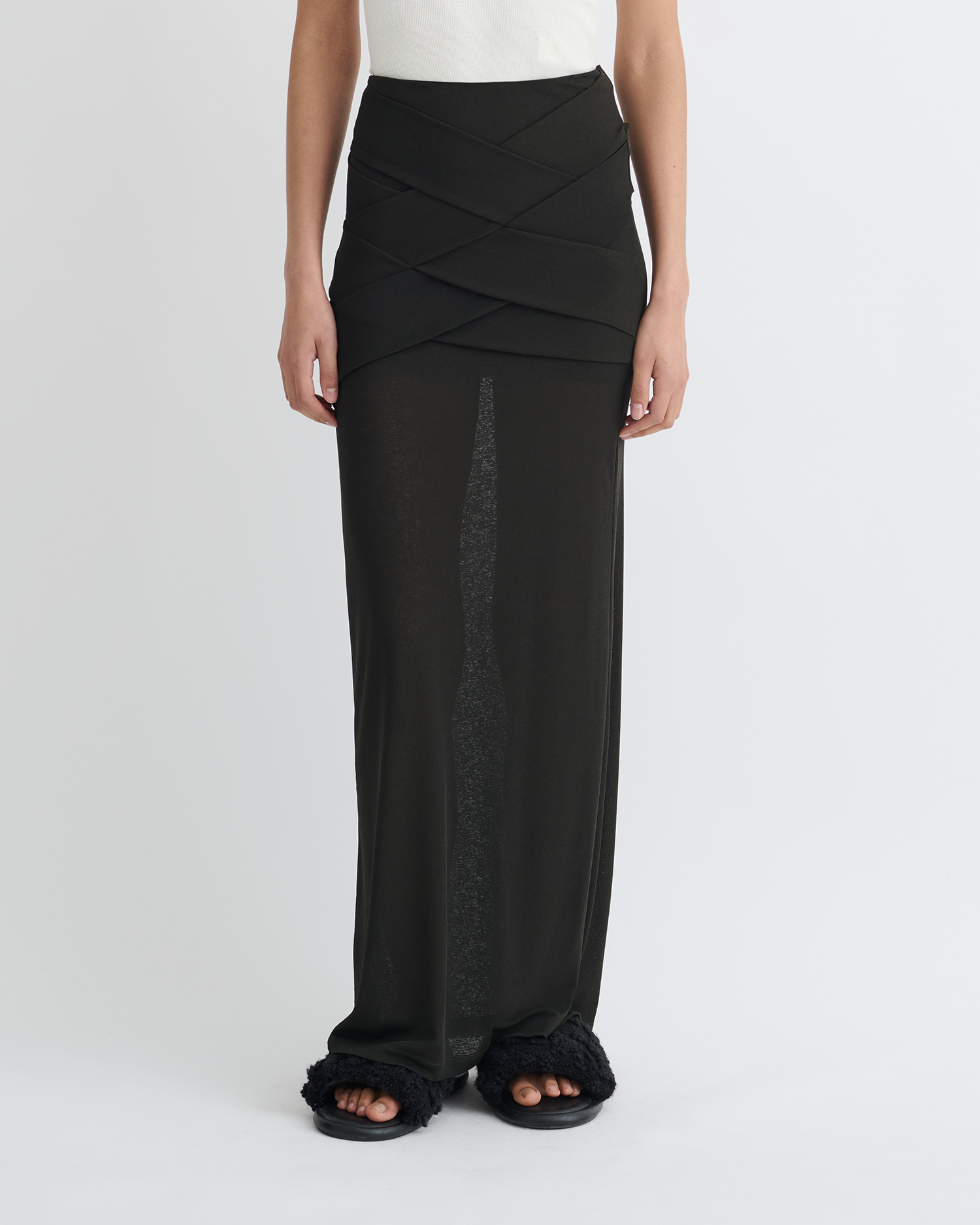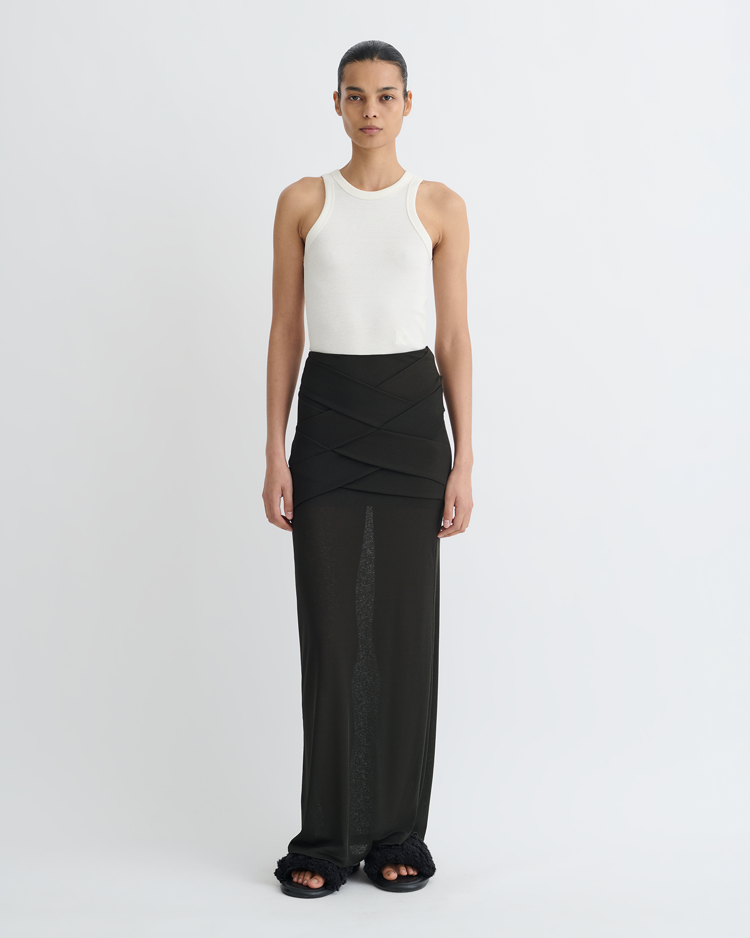 The Shanda skirt is made from soft and lightweight mesh jersey with a crisscross of draping at the waist. The maxi length is effortless and elegant.