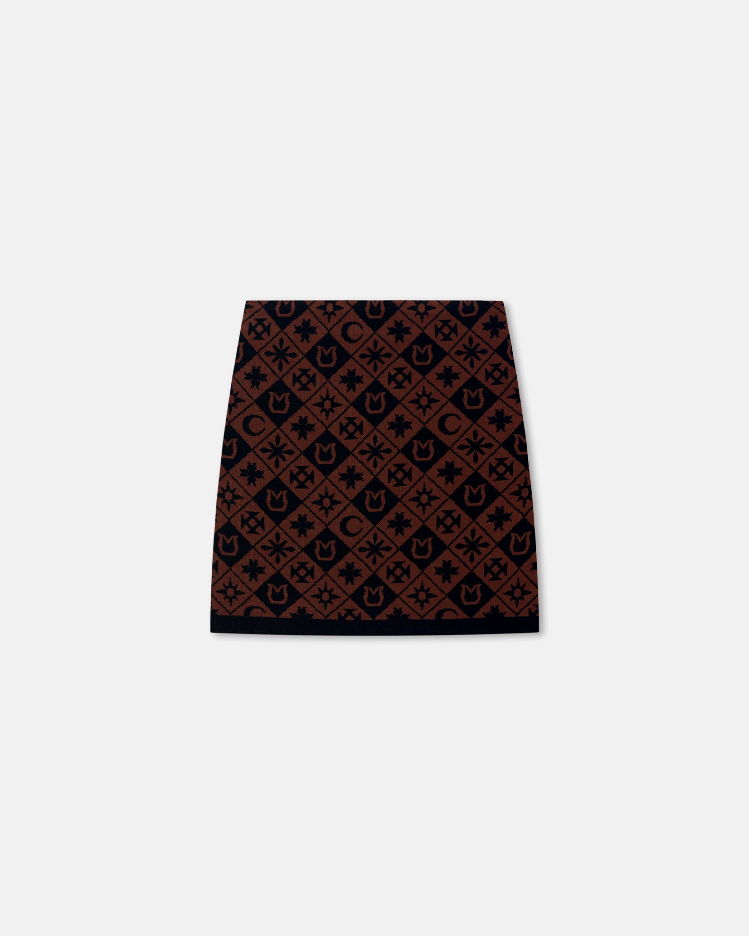 The Elze skirt is knitted from compact viscose with a hint of natural stretch and constructed to create a close fit. It’s decorated with our expressive Symbol Tile print, coordinating with the Dovie cardigan.