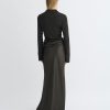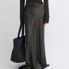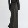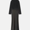 Fabric blocking is a continued story for Pre-Fall 2025, balancing ease with elegance. The Scylla dress is made up of a dark-green mesh jersey shirt and black slip satin skirt – the draped waist is super flattering.