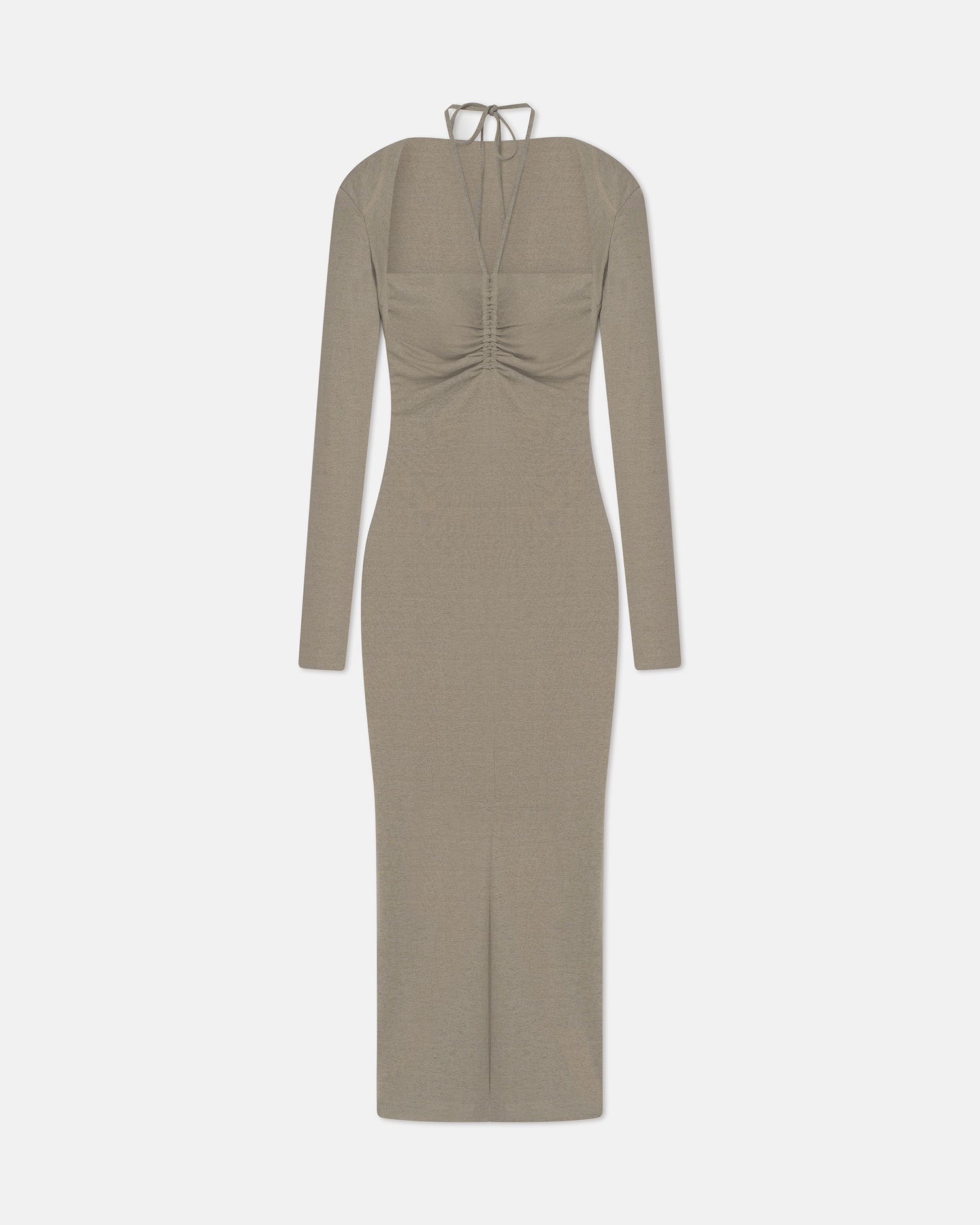 Nanushka’s Aponi Dress merges structure and fluidity. Crafted from soft mesh jersey, its wide shoulders and ruched bodice create a sculptural elegance. Part of the Fall-Winter 25 collection, Aponi expresses strength and sensuality in equal measure, an emblem of modern femininity grounded in effortless elegance.