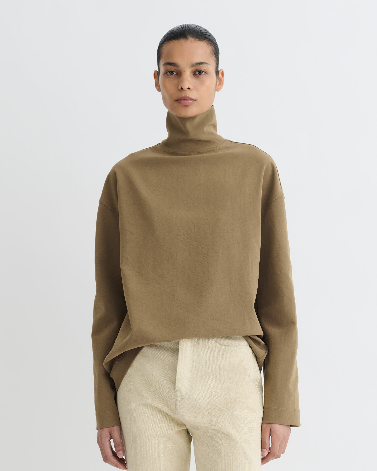 The Sitara top is made for understated sophistication. Cut from luxuriously lightweight paper jersey, it drapes fluidly from a chic turtleneck.