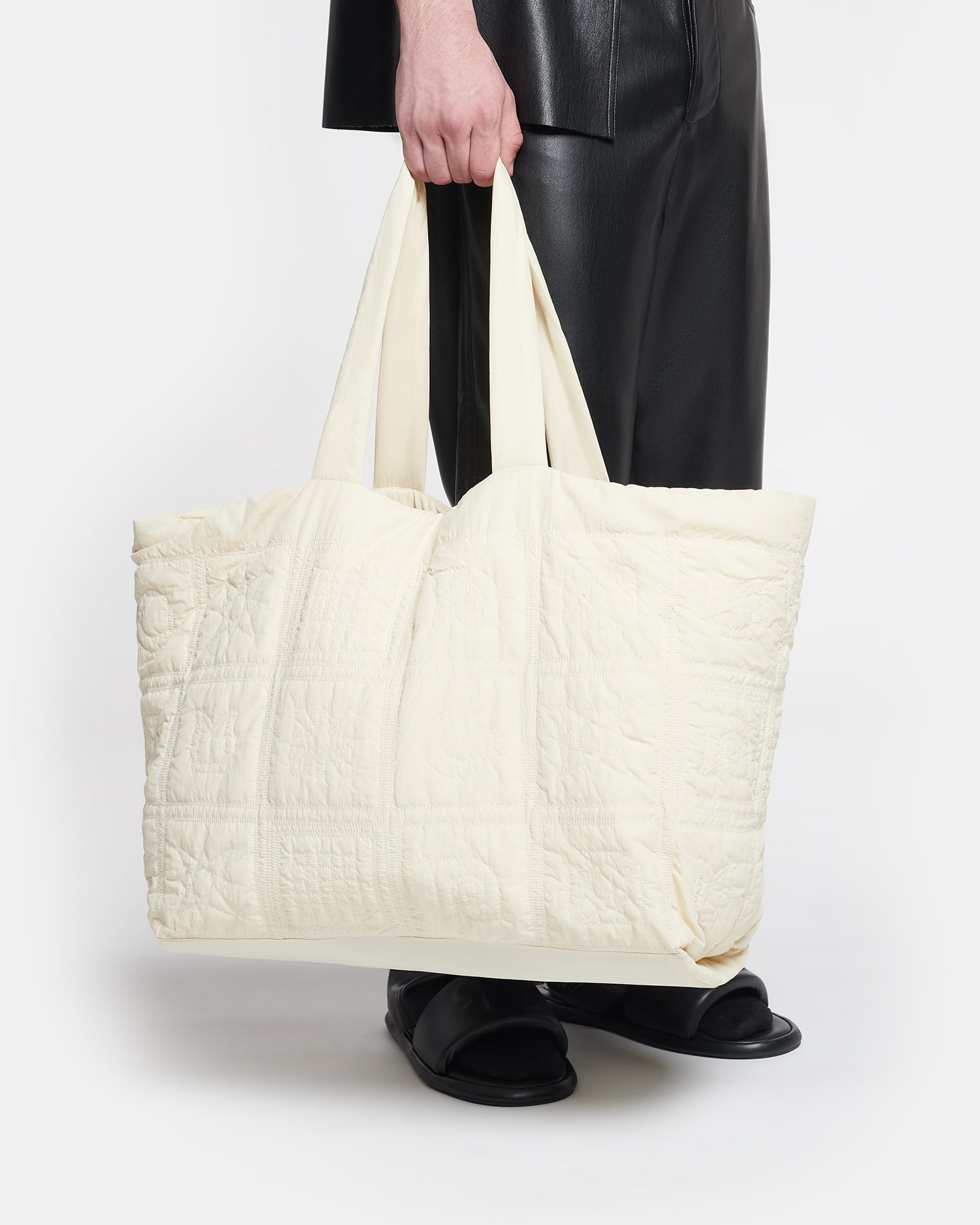 The Soft Tote is inspired by classic sports styles from the 90s. It is crafted from functional tech poplin with a quilted texture and traditional Hungarian Kopjafa motifs. The shape is designed to be capacious yet easy to carry every day.