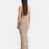 The Haylen dress demonstrates our innovative craft techniques. In a new, textured fabrication, it’s made from seersucker tech chiffon decorated with an ocelot pattern and has for a halterneck sweetheart neckline to sculpt your frame. It falls to a midi length with a side slit.