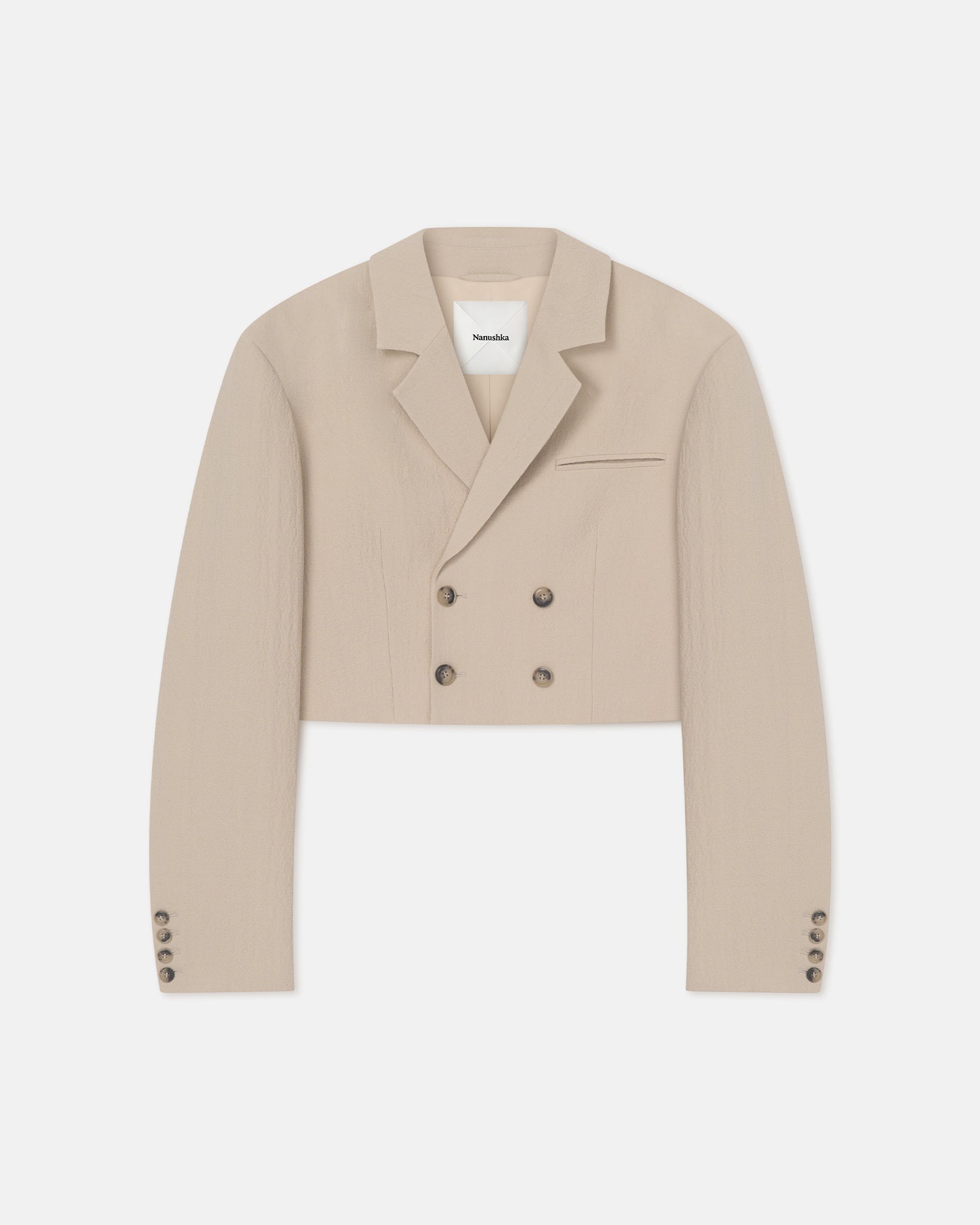 Nanushka’s Rony Blazer reimagines tailoring with a sculptural clarity. Made from seersucker suiting, this boxy cropped double-breasted blazer sharpens the shoulders.