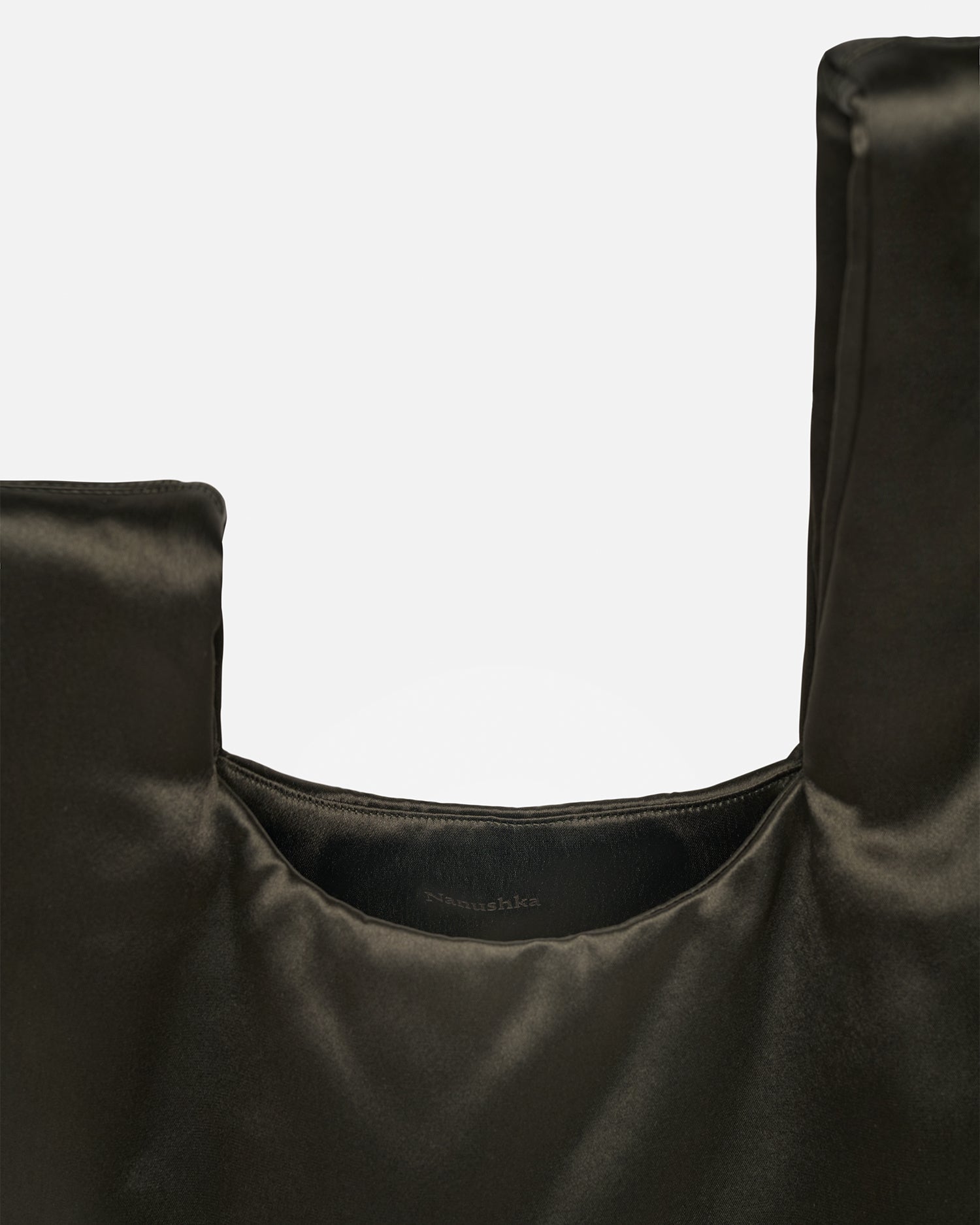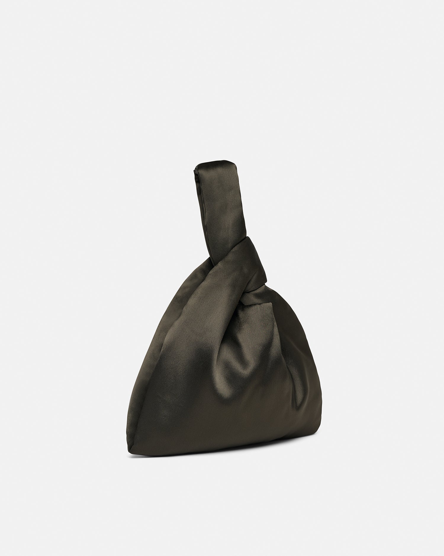 We continually look to update our hero pieces through material innovation and manipulation. This version of our Jen bag is crafted from satin in a dark-green tone. With a slouchy triangular shape and looped wrist-strap, it is perfectly sized for evening essentials.