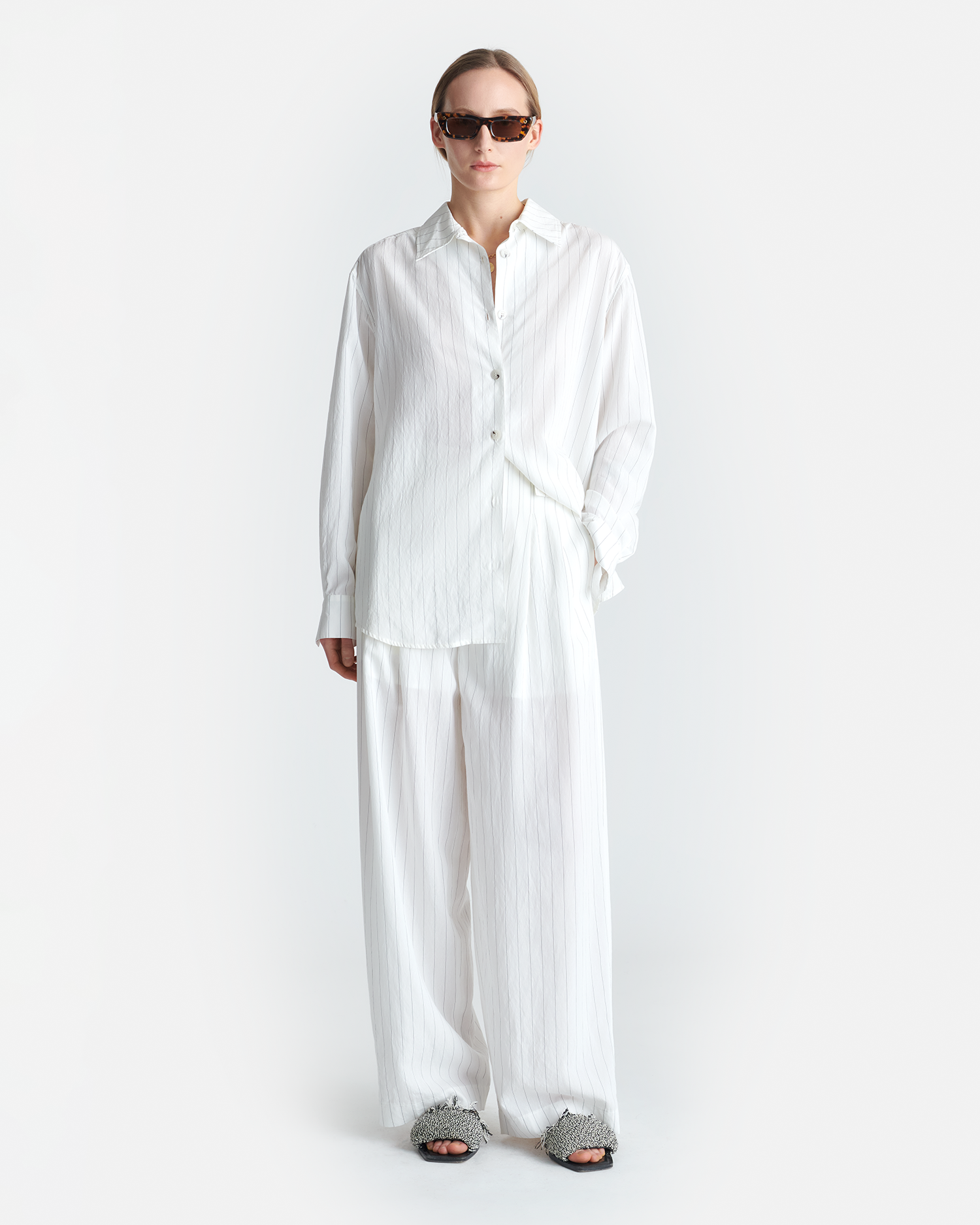 The Fryda shirt is made from a lightweight suiting fabric for an easy-going boxy fit. Decorated with subtle stripes, it’s designed to be worn with the matching shorts.