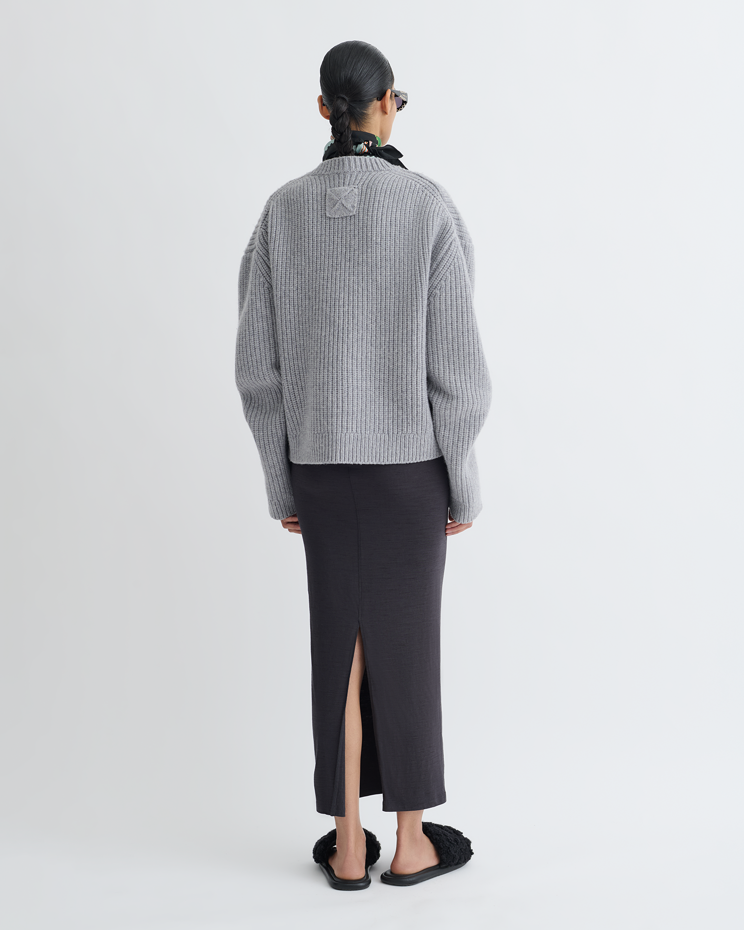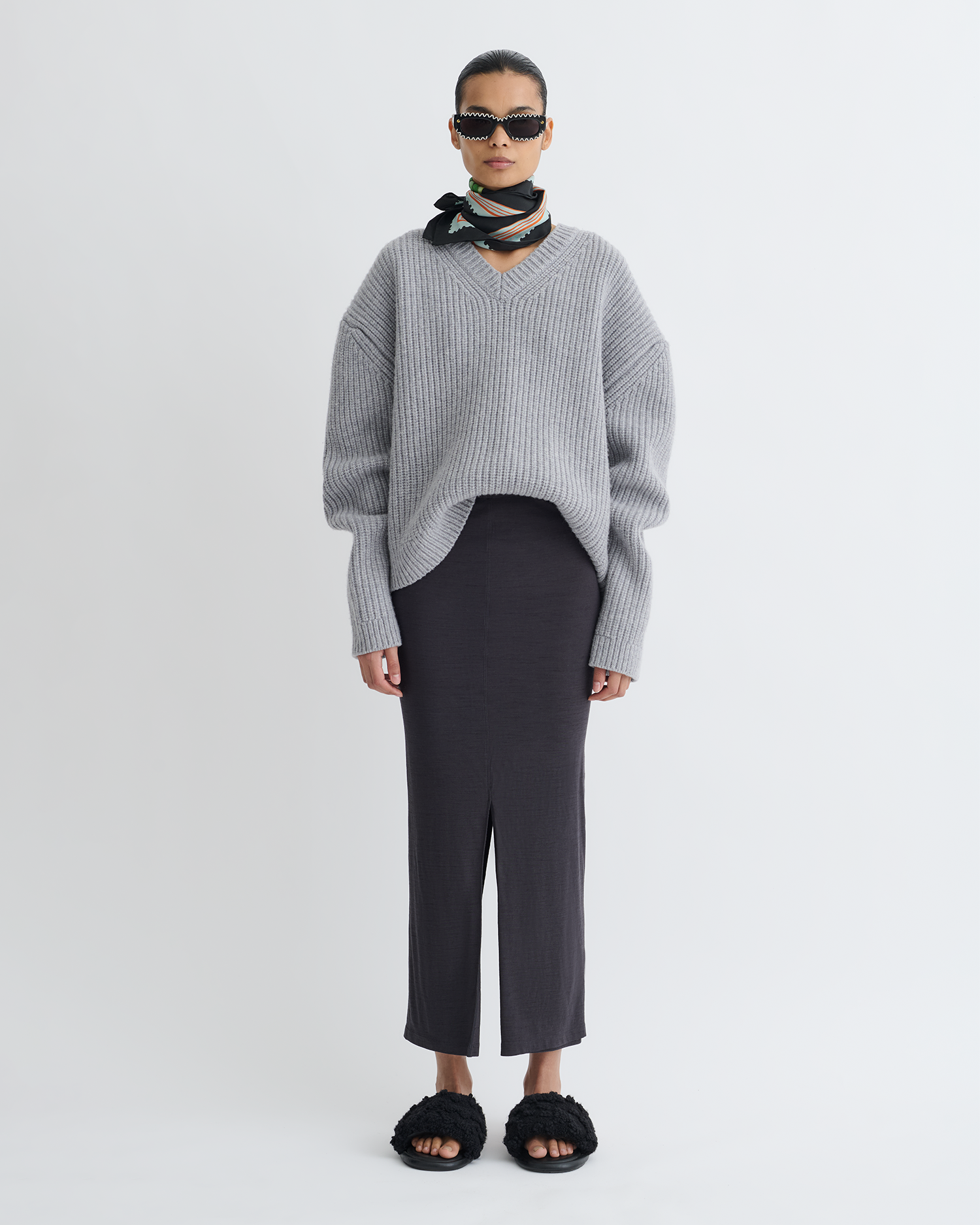 The Rafa skirt has a 90s minimalist feel. Made from jersey with a touch of wool for softness, it sits low on the waist with a front slit.